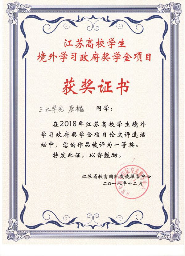 我校学生康樾在2018年江苏高校学生境外学习 政府奖学金项目论文评选活动中荣获一等奖