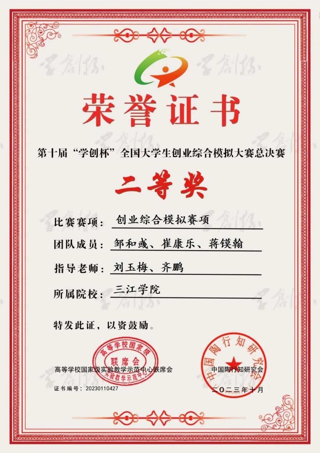 “学创杯”是由教育部高等学校国家级实验教学示范中心联席会经济与管理学科组主办的,为激励大学生弘扬时代精神、培养创业意识、提高创业能力而发起。在教育部发布的《2023全国普通高校大学生竞赛分析报告》竞赛目录中,“学创杯”全国大学生创业综合模拟大赛是教育部认可的具有较高含金量和参赛价值的赛事之一。