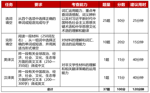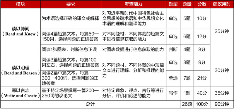 请在比赛开始前半小时登录大赛官网准备线上作答。比赛时间共120分钟。校赛综合能力赛项试题由大赛组委会提供,包括客观题若干道和议论文写作1篇,进行读写译综合考查,赛题构成见下表: