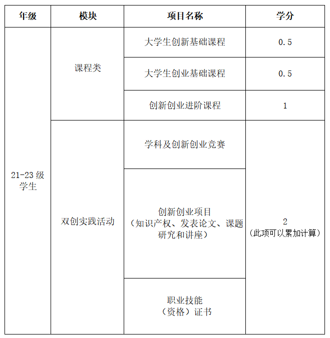 121-23级学生双创实践活动中的学科竞赛、创新创业项目以及职业技能(资格)证书可以累加计算,直至2分为止。