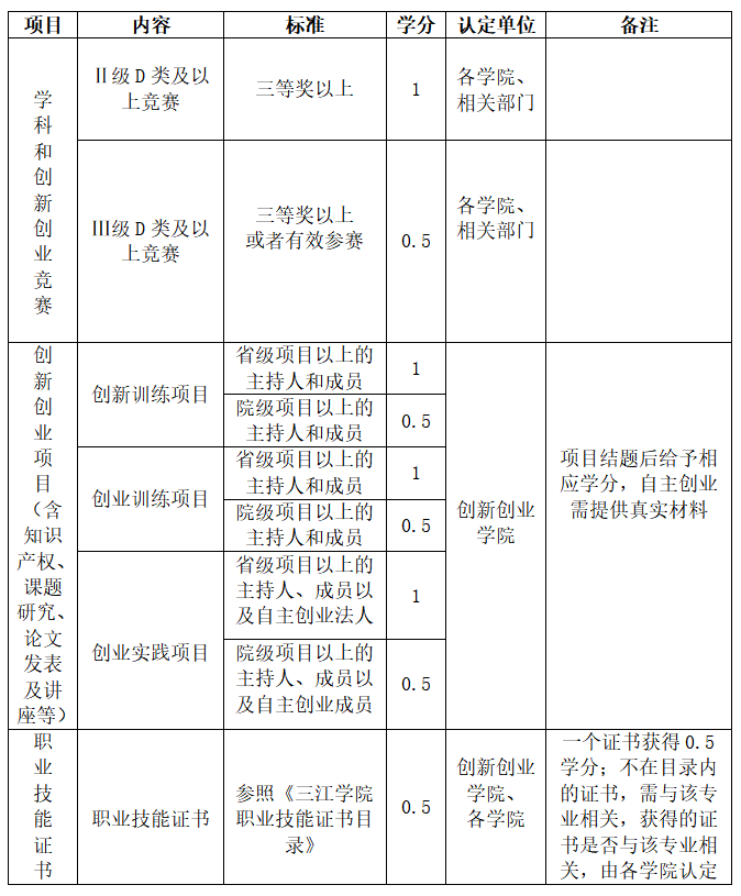 2学生参加同一活动、完成同一工作,重复获奖或取得不同类型及等级的成果,以最高等级记取创新创业教育学分,已计入《三江学院大学生创新创业活动置换课程》成果,不得重复认定创新创业教育学分。