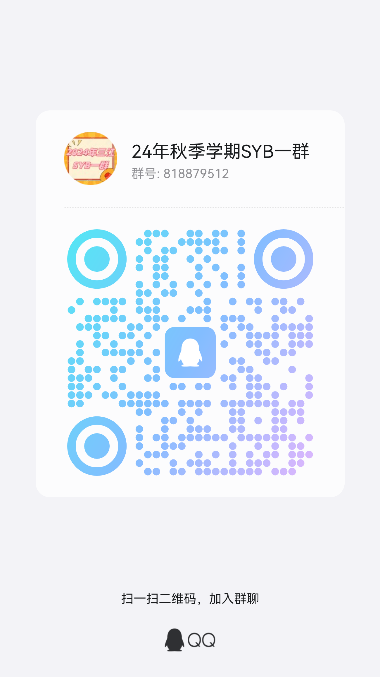 2.报名SYB加入QQ群,群1(818879512)、群2(681183555),群满后可根据群管理员回复加入指定群;入群后请修改群名片,格式为“学号+姓名”。