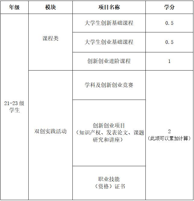121-23级学生双创实践活动中的学科竞赛、创新创业项目以及职业技能(资格)证书可以累加计算,直至2分为止。
