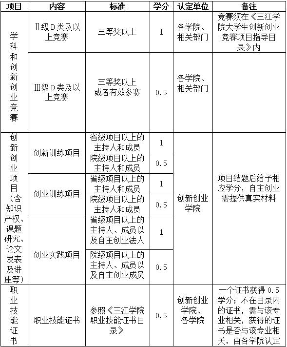 2学生参加同一活动、完成同一工作,重复获奖或取得不同类型及等级的成果,以最高等级记取创新创业教育学分,已计入《三江学院大学生创新创业活动置换课程》成果,不得重复认定创新创业教育学分。
