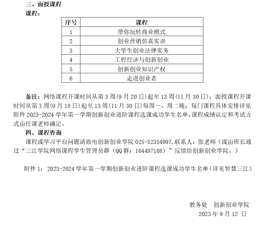 关于2023-2024学年第一学期创新创业进阶课程上课的通知