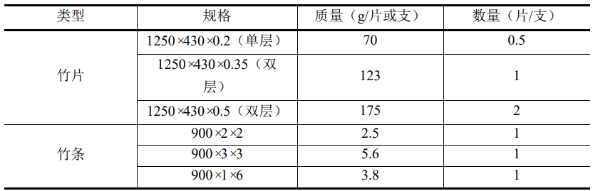 1)竹材采用本色复压竹材,提供的竹材规格及数量如表 所示,竹材力学指标参考表 2