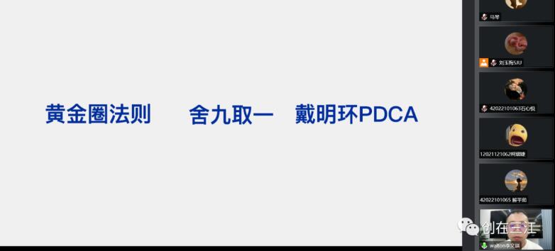 李总介绍了如何成功抓住机会的三个要点(黄金圈法则、舍九取一、戴明环PDCA),戴明环工作模型是他在过往工作生活中用得最多的。而黄金圈法则的三个部分1、Why,即目的、理念;2、How,即方法、措施;3、What,即现象、成果,李总以阿里巴巴“天下没有难做的生意”实例向我们展开讲解。