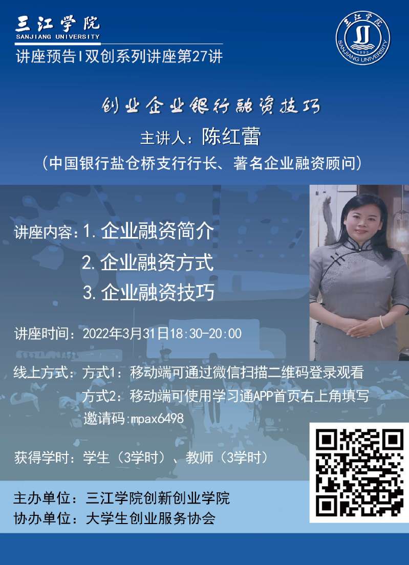 讲座预告丨三江学院双创系列讲座第27讲——《创业企业银行融资技巧》